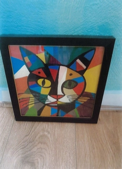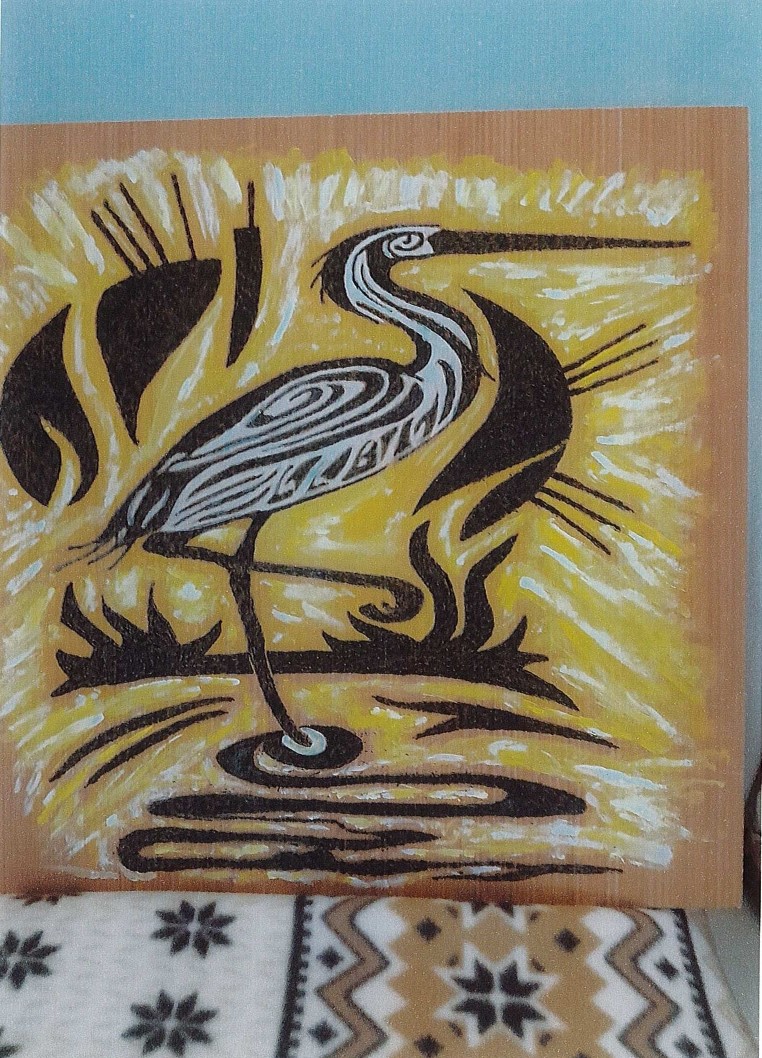 Other pieces include a striking canvas of a cat and a more recent one that Jim has been working on is a visual of a pelican. He originally sketched the design onto a thin piece of wood, using a wood burning tool Jim then scorched around the design, added some colour using paint and then varnish to finish. Jim loved creating this piece so much that he took it home with him to continue working on it.